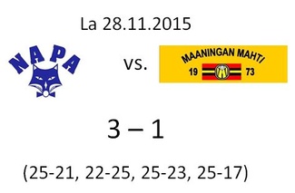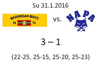 Napakettujen nuorelle joukkueelle täytyy antaa täysi tunnustus hienosta ottelusta ja 3-1 voitosta. NaPa hallitsi ottelua koko ajan lukuunottamatta toisen erän loppua, jossa Juhin syöttövuorolla Mahti kipusi erävoittoon oltuaan erässä jo selkeästi tappiolla. Edes hieno nousu toisen erän voittoon ja sitä seurannut 5-1 johto kolmannen erän alussa ei vapauttanut Mahdin peliä, vaan erinomaisen syöttö-vastaanottopelin pelannut ja sen ansiosta myös hienosti puolustanut ja hyökännyt kotijoukkue vei ottelun nimiinsä. Mahtimiehistä ainoana omalla tasollaan pelasi Juhi, jonka otteissa ei pitkä pelitauko tuntunut.