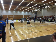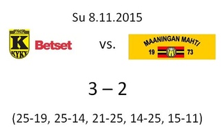 Kolmannenkin erän alku jatkoi samaa kaavaa, mutta sitten jostain kummallisesta syystä KyKy-Betsetin joukkue alkoi tehdä omia virheitä ja siitä innostuneena kokoonpanoaan ottelun aikana moneen otteeseen muokannut Mahti pääsi kuin pääsikin peliin mukaan. Mahti sai lisää vaikeutta syöttöihinsä ja kampesi erävoittoon 25-21 kenties jo helppoon otteluvoittoon tuudittautuneen kotijoukkueen ohi. Neljäs erä olikin sitten puolestaan täysin Mahtimiesten heiniä ja kotijoukkueen peli sekosi totaalisesti. On tämä lentopallo kyllä melkoinen mentaalilaji... Erän loppupuolella tapahtui vielä ikävä loukkaantuminen, jossa KyKy-Betsetin luottoyleispelaaja Atte Kyrölä loukkasi ilmeisesti nilkkansa vaarattoman näköisesstä tilanteessa ja joutui jättämään ottelun siihen. Pienen huoltotauon jälkeen jatkuneen erän kuittasi nimiinsä Mahti 25-14. Toivottavasti Atte toipuu pian pelikuntoon - tsemppiä sinne!
