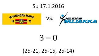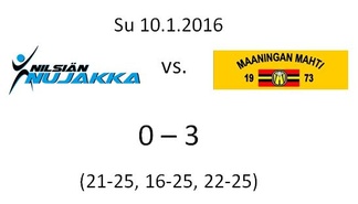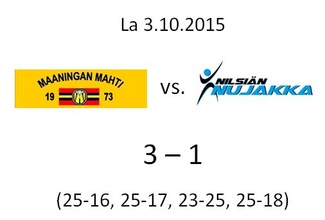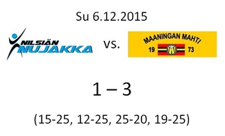 Mahtimiehillä oli otteluun lähdettäessä tuoreessa muistissa todella synkkä edellisen viikonlopun Rovaniemen ottelumatka, josta saaliiksi jäivät vain bussissa puutuneet persaukset ja armoton ketutus... Joukkue tulikin otteluun todella kovalla latauksella, jotta elintärkeät sarjapisteet saataisiin kairattua pistepussiin. Mahti pelasi kaksi ensimmäistä erää tasokasta peliä jokaisen osa-alueen toimiessa tasapainoisesti. NiNu puolestaan sortui virheisiin ja alistui todella helposti selvin 25-15 ja 25-12 lukemin. Harvinaisen "rumat" lukemat yleensä tasaisten Nilsiässä käytyjen vääntöjen tuloksiin peilaten. Nujakka oli aivan kuin unessa ottelun alussa, kuten myös hieman ottelun tuomaristokin, joka tämän itsekin pelin jälkeen myönsi...