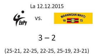 Hillerierässä pelattiin sitten ei-niin-kaunista, mutta taistelevaa lentopalloa puolin ja toisin tunnetason kohotessa niin kentällä, valmennusosastoilla kuin katsomossakin. EnPy ehätti ensin ottelupalloon, joita heille taisi tulla ensin viisi kappaletta peräkkäin. Mahtimiehet harasivat vastaan ja saivat itselleen edun sekä kolme mahdollisuutta ottelun katkaisemiseen. No, ei ollut tänään Mahtimiehistä ottelun päättäjiksi vaan kahden pitkäksi menneen Sputnik-lyönnin ja pehmeän vastapallon jälkeen EnPy kampesi jälleen rinnalle ja lopulta ohi voittoon saakka erän päättyessä 23-21. Mahdille siis kolmen tunnin päätteeksi vain yksi sarjapiste ja Kuopion torin joulukuusen pituinen sarvi otsaan. EnPy puolestaan päätti alkusarjansa maukkaaseen voittoon ja lähti voitolla yöhön...