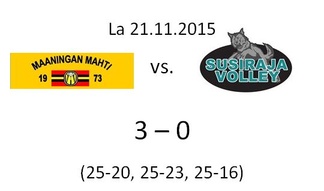 Pitkähkön tauon jälkeen Mahtimiehet palasivat kotisaliin sarjapelin merkeissä. Vastustajaksi saapui kova mittari, Susiraja Volleyn joukkue Joensuusta/Liperistä. Mahdin vierailu Reijolaan syksyllä tuotti 3-2 tappion, joten revanssimielellä Mahtimiehet ottivat vieraat vastaan. SurVon matka Maaningalle oli ollut lumituiskuinen ja lisää lunta tupaan heille tarjosi kotijoukkue Mahti, joka otti otteluvoiton suoraan 3-0.