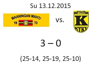 Mahdin päivän kolmas ottelu pelattiin Kuopio-hallin sijaan Tekulla, jossa sali on samantapainen kuin kotisali Maaningan Urheilutalolla. Vastustajana ottelussa oli siis Team PUM Virroilta. Lieneekö "normaalimpi" sali auttanut Mahtimiesten peliä vai oliko tuntuma kahden pelatun ottelun jälkeen parempi, mutta joka tapauksessa Mahti jyräsi voittoon selvin lukemin 2-0 (25-17, 25-13).