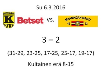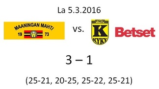 Kolmannenkin erän alku jatkoi samaa kaavaa, mutta sitten jostain kummallisesta syystä KyKy-Betsetin joukkue alkoi tehdä omia virheitä ja siitä innostuneena kokoonpanoaan ottelun aikana moneen otteeseen muokannut Mahti pääsi kuin pääsikin peliin mukaan. Mahti sai lisää vaikeutta syöttöihinsä ja kampesi erävoittoon 25-21 kenties jo helppoon otteluvoittoon tuudittautuneen kotijoukkueen ohi. Neljäs erä olikin sitten puolestaan täysin Mahtimiesten heiniä ja kotijoukkueen peli sekosi totaalisesti. On tämä lentopallo kyllä melkoinen mentaalilaji... Erän loppupuolella tapahtui vielä ikävä loukkaantuminen, jossa KyKy-Betsetin luottoyleispelaaja Atte Kyrölä loukkasi ilmeisesti nilkkansa vaarattoman näköisesstä tilanteessa ja joutui jättämään ottelun siihen. Pienen huoltotauon jälkeen jatkuneen erän kuittasi nimiinsä Mahti 25-14. Toivottavasti Atte toipuu pian pelikuntoon - tsemppiä sinne!