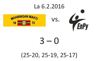 Tähän toisen erän loppuun tämä ottelu sitten käytännössä ratkesikin, eikä EnPy enää kolmannessa erässä pystynyt haastamaan kuin ajoittain. Mahdin johdolla taputeltiin erä loppuun 25-19 ja koko ottelu siis kotijoukkueelle 3-0. Enonkosken joukkueesta ei kukaan tässä ottelussa pystynyt kovin ehjään suoritukseen vaan koko joukkue oli aika tasaista massaa - välillä hyviä suorituksia ja hetkiä, mutta niiden vastapainoksi paljon omia virheitä ja lahjapisteitä Mahdille. Tasaisin suorittaja oli parhaana palkittu passari Jonne Väisänen, joka yritti löytää ns. kuumaa pelaaja jakaen passeja tasaisesti kaikille miehille ja paikoille, mutta tällä kertaa muiden tuki jäi vaatimattomaksi. Mahdilta pirteintä tekemistä löytyi myös parhaana palkitulta passari Matti Mustoselta, hakkurina pelanneelta Lauri Heikkiseltä sekä toisessä erässä yleispelaajan paikalle vaihdosta tulleelta ja Mahdin joukkueen sytyttäjänä toimineelta Simo Koskiselta.