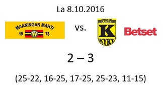 Viides ja ratkaiseva erä alkoi jälleen vierasjoukkueelta vahvasti, eikä se enää suostunut otteluvoitosta luopumaan Mahdin hyvästä yrityksestä huolimatta. Erä KyKy-Betsetille 15-11 ja koko ottelu lopulta ansaitusti 3-2. Lentopallo on siinäkin mielessä mukava laji, että joka kerta parempi joukkue lopulta voittaa eikä kenenkään arvitse jäädä jossittelemaan - ainakaan kovin paljon :)