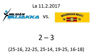 Lauantaina 11.2. oli vuorossa kauden toinen paikalliskamppailu, kun Mahti matkusti Nilsiään kohdatakseen Nujakan. Edellinen kohtaaminen Maaningalla marraskuun alussa oli päättynyt kotijoukkue Mahdin selvään 3-0 voittoon, mutta missään nimessä joukkue ei lähtenyt otteluun ns. takki auki, sillä Nujakan tiedettiin parhaimmillaan olevan todella hankala vastustaja. Mahdilta puuttuivat ottelusta Ankudovich, Ivanov, Koskinen ja Kupari, joten liikkeellä oltiin kapealla rosterilla.