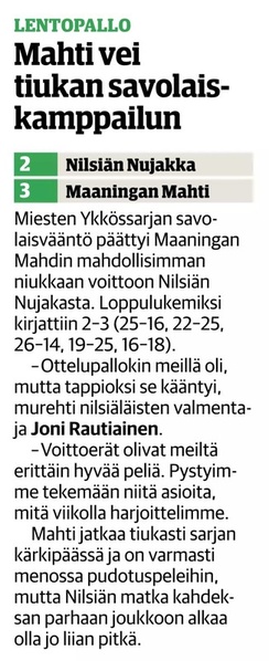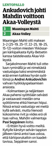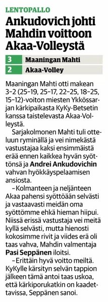 Mahti - Akaa-Volley -ottelun juttu Akaan Seutu -lehdessä.