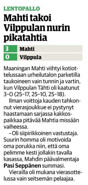Kuten tuli jo aivan tämän sepustuksen alussa todettua, ovat tasoerot juuri tällä hetkellä ykkössarjassa todella suuret. Vilppulan Tähden toimesta oli Mahtimiehiä kehuttu viikko aikaisemmin melkoisin ylisanoin, kun taas Hurmos-ottelussa edellisenä päivänä joukkue oli jäänyt pahasti alakynteen. Nyt oli taas Mahtimiesten vuoro viedä vieraitaan melko lailla näytöstyyliin erien päättyessä kotijoukkueen voittoon 25-19, 25-17 ja 25-20. Näin Mahti siis jatkaa ykkössarjassa puhtaalla pelillä kolmen pelatun ottelun jälkeen eräsuhteen ollessa 9-0. Nurmon Jymylle päivän tappio oli kauden kolmas yhtä monen pelatun ottelun jälkeen ja eräsuhdekin on murheellinen 1-9. Kotijoukkueen parhaana palkittiin tänään hakkurin saappaisiin astunut Meriruoko ja vierasjoukkueen paras oli hakkuri Matias Saviaro, joka pystyi ajoittain puhkomaan hyvin kotijoukkueen torjunta-puolustuksen.