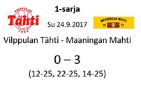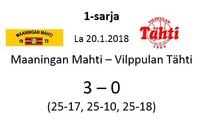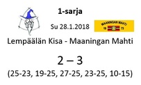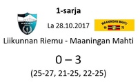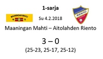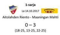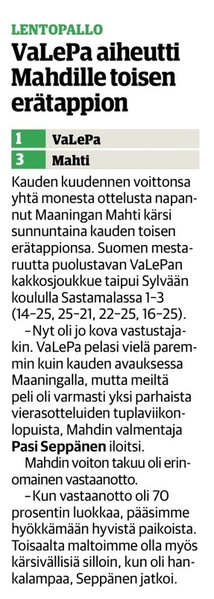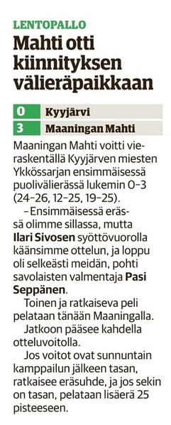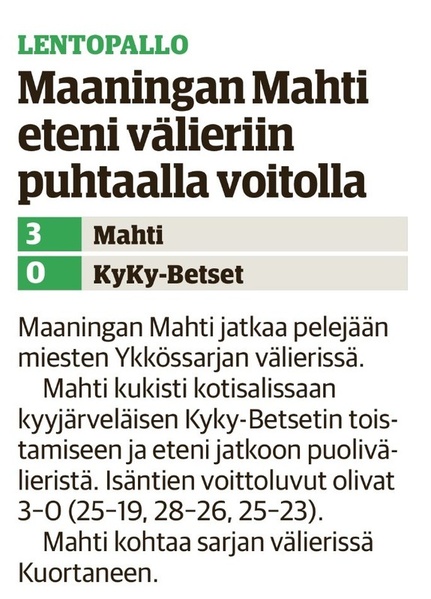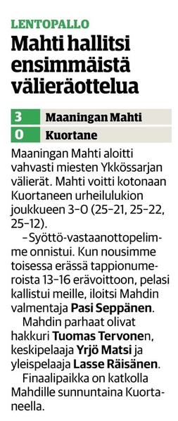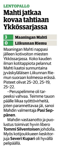 Aitolahden Riennon kahdella voitolla alkanut runkosarja jatkuu siis kolmen perättäisen tappion rasittamana. Mahti puolestaan jatkaa viiden ottelun jälkeen tappioitta hävittyään ainoastaan yhden erän. Huomenna sunnuntaina Mahti pelaa vierasottelun Sylvään koululla Sastamalassa, jossa se kohtaa jo toistamiseen tällä kaudella Vammalan Lentopallon kakkosjoukkueen. Tuo klo 17.00 alkava ottelu on taatusti tasoltaan kovempi kuin tämän päivän ottelu, joten Mahtimiesten täytyy pystyä parempaan esitykseen mieliäkseen säilyttää tappiosarakkeensa tyhjänä. VaLePa 2 oli Maaningalla kauden avausottelussa hyvin taisteleva ryhmä, ja saa todennäköisesti vahvistuksia huomiseen otteluunsa edustusjoukkueensa farmipelaajista, joten mielenkiintoinen kamppailu on odotettavissa. Ottelusta tulee jälleen livelähetys tutusti Mahdin kanavalla, joten kaikki Mahti-fanit huomenna klo 17.00 netin ääreen etäkannattamaan Mahtimiehiä!