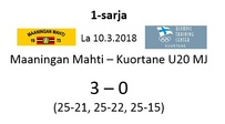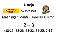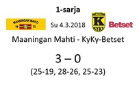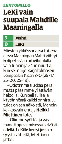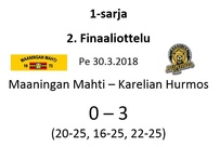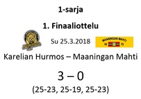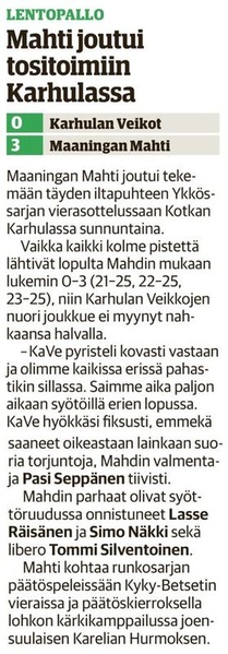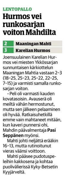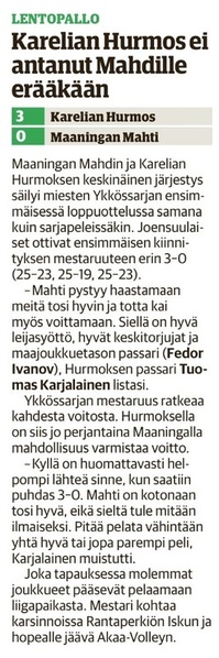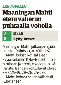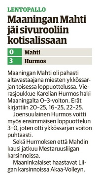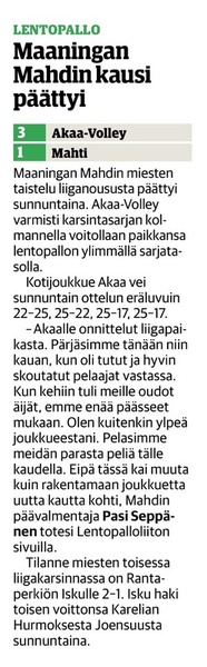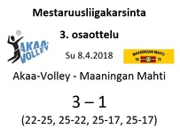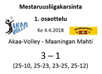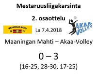 Maaningan Mahti oli onnistunut nappaamaan erävoiton Akaa-Volleyn kotikentällä Toijalan Monarilla keskiviikkona pelatussa Mestaruusliigakarsintojen ensimmäisessä osaottelussa. Eikä toinenkaan erävoitto ollut tuolloin kaukana. Sen vuoksi joukkueella oli luja luottamus siihen, että kotikentällä vierasjoukkue pannaan polvilleen ja tasataan ottelusarja. Toisin kuitenkin kävi, sillä Mahdin miehekkäästä taistelusta huolimatta otteluvoiton vei Akaa-Volley suoraan 3-0, minkä ansiosta sillä on mahdollisuus katkaista ottelusarja jo seuraavassa pelissä sunnuntaina 8.4.