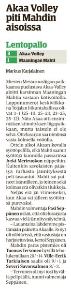 Mestaruusliigakarsintojen avausvoitto meni siis ansaitusti Akaa-Volleylle 3-1, mutta ottelu osoitti sen, että parhaalla tasollaan pelatessaan Mahti pystyy aivan tasapäiseen voittokamppailuun. Mahdin päävalmentaja Pasi Seppänen tuumaili ottelun jälkeen, että Mahdilla on täydet saumat kaataa Akaa etenkin kotikentällään. Tasoero on yllättävänkin pieni, ja sopivalla paineistuksella Mestaruusliigassa toiseksi viimeiseksi jääneen Akaan peli on murrettavissa. Toki hurjat hyökkäystehot avausottelussa tehnyt Joni Mikkonen täytyy saada paremmia aisoihin, mutta hänen kesyttämisekseen lääkkeet ovat jo tiedossa...