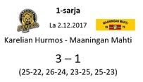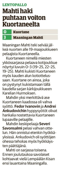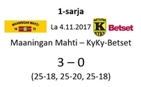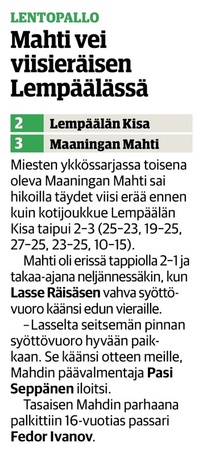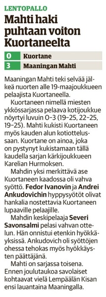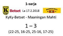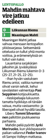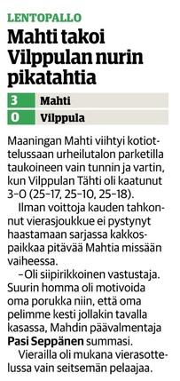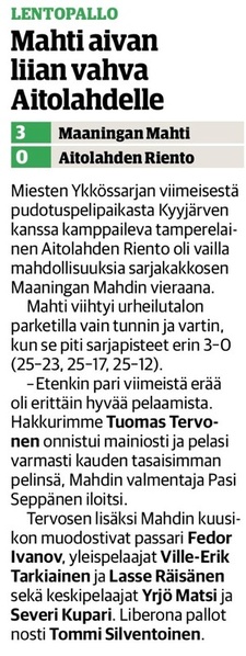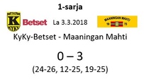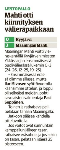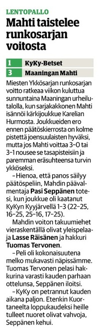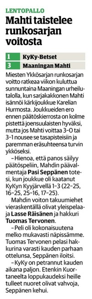 Mahti: Tervonen 19/+7 (51 hyökkäystä!), Sivonen 12/+6, Matsi 12/+8, Savonsalmi 21/+18, Ankudovich 12/+5 ja Räisänen 7/-5. Vastaanotto 40% ja hyökkäys 42%.