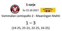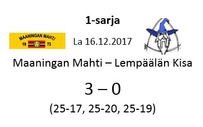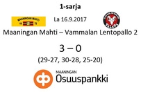 Mahdin ykkössarjakausi 2017-2018 alkoi kotiottelulla Vammalan Lentopallon kakkosjoukkuetta vastaan. Vastustajajoukkue koostuu nuorista lahjakkuuksista, ja joukkue säilytti viime kaudella ykkössarjapaikkansa vasta karsintojen kautta Mestaruusliigajoukkueensa farmipelaajien tuella. Nyt nämä nuorukaiset ovat vuotta vanhempia ja kokeneempia, ja täytyy todeta joukkueen parantaneen peliään reilusti viime kaudesta. VaLePa 2 tulee olemaan tällä kaudella yllätysvalmis joukkue, joka varsinkin kotikentällään on paha kanto monen vierasjoukkueensa kaskessa.