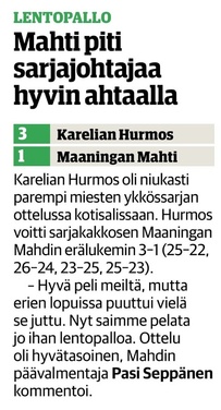 Hurmos säilyi siis edelleen voittamattomana Mahtimiehille. Ero joukkueiden välille tuli tällä kertaa syöttö-vastaanottopelissä, jossa yleensä vahva Mahti sai nyt tunnustaa kotijoukkue Hurmoksen paremmakseen. Hurmoksen hyökkäyskalusto on ykkössarjaan niin kova, että joukkuetta on todella vaikea voittaa jos sen pelinrakentelua ei saa kunnolla rikki. Mahtimiesten ei kuitenkaan tarvitse missään nimessä painaa leukaa rintaan, sillä sen on mahdollista parantaa omaa suoritustaan paljon tämänpäiväisestä.