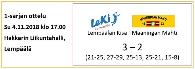 Kun Mahtimies tekee jotain, hän tekee sen kunnolla. Pelin kulkiessa, olemme todella hyviä ja nähtävästi, kun alamme puristaa, teemme senkin täysillä. Tämä nähtiin lauantai-iltana, kun Lempäälän Kisa kävi nautiskelemassa lentopallosta kolmen erän verran Pielaveden liikuntahallilla. Tällä kertaa muita nauttijoita ei paikalla sitten ollutkaan. Peli päättyi siis LeKin suoraan 3-0 voittoon.