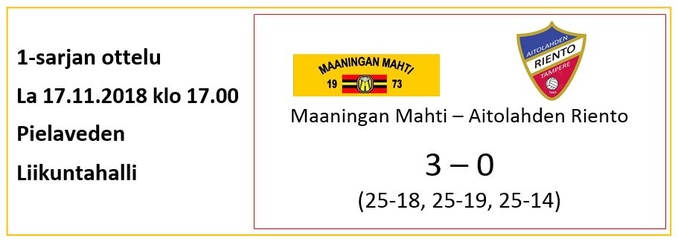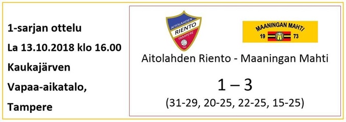 Niin vaan viikko on taas vierähtänyt ja luvassa peliviikonloppu vieraissa. Mahtimiehet matkaavat lauantaina Aitolahden Riennon vieraaksi Tampereen seudulle. Riennolla käynnistyy kolmas vuosi 1-sarjassa ja se on Akaa-Volleyn farmijoukkue. Joukkue on vuosittain ottanut pieniä kehitysaskelia ja tavoittelee tällä kaudella pudotuspelipaikkaa.