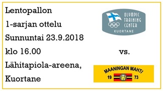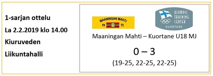 Seuraavaksi Mahtimiehet kohtaavat Kuortaneen Valmennuskeskuksen nuoren poikien maajoukkueen kotiottelussaan, joka pelataan poikkeuksellisesti Kiuruveden Liikuntahallilla tulevana lauantaina 2.2.2019 klo 14.00 alkaen. Kuortaneen joukkueessa pelaa mm. kiuruvetinen Vili-Valtteri Help sekä monia muita Pohjois-Savon alueen nuoria pelaajia, joten siinäkin mielessä edessä on mielenkiintoinen ottelu. Mahti toivoo, että kiuruvetinen tunnetusti laatutietoinen lentopalloväki saapuisi runsain joukoin ottelua katsomaan ja kannattaisi samalla myös Luomu Wolleyn junioritoimintaa käyttämällä hyväkseen LuoWon kanttiinipalveluita ottelun yhteydessä - kanttiinituotot menevät lyhentämättöminä Luomu Wolleyn hyväksi!