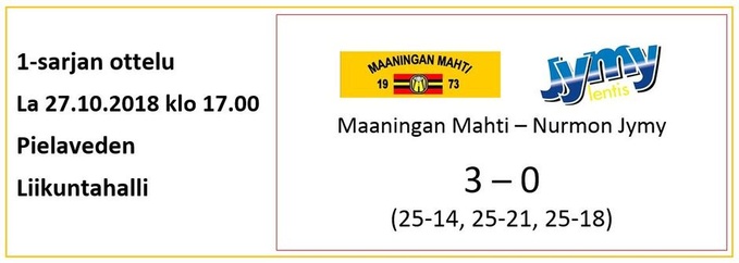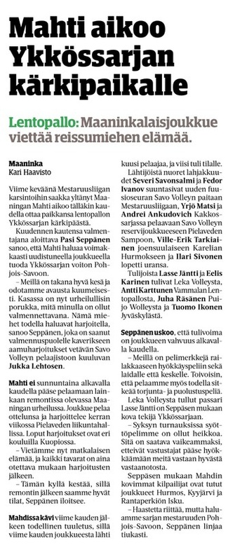 Mahti aloitti kauden voitolla Kuortaneesta, ja videolta valmentajat ovat tehneet tarkempaa analyysia omasta pelistä. Viikon aikana on pystytty harjoittelemaan täysipainoisesti ja on keskitytty parantamaan pelistä löytyneitä heikkouksia. Tulevana lauantaina vastus onkin sitten astetta kovempi, kun verkon toisella puolen astelee Karelian Hurmos Kiteellä pelattavassa ottelussa.