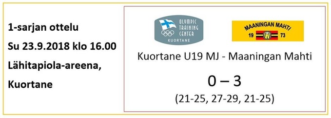 Kauden avausottelu on aina omanlaisensa spesiaalitapaus, ja siksipä pientä kutkuttavaa odotuksen sekaista jännitystä oli Mahtimiehistössä havaittavissa sen matkustaessa Kuortaneelle nuoren U19-maajoukkueen kotisaliin. Tällä kaudella Valmennuskeskuksen ykkössarjassa pelaava joukkue koostuu 2001-2002 syntyneistä lentopallolahjakkuuksista, jotka äskettäin aloittaneen uuden valmennuskaksikkonsa Manlio Puxeddu (ITA) - Daryl Tay (SGP) johdolla lähtivät haastamaan viime kauden ykkössarjan kakkosia.
