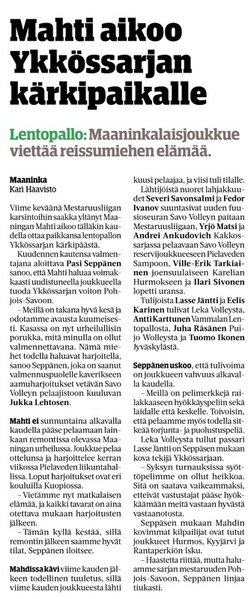 Maaninkalaiset lentopalloihmiset joutuvat valitettavasti hyvästelemään tämän kauden osalta loistavaan pelikuntoon päässeen hakkuri Tuomas Tervosen. Hän ottaa suunnaksi Saksan ja on poissa kokoonpanosta loppukauden. Mahtimiehet kiittävät Tuomasta ja toivottavat hänelle onnea uusien polkujen talsimisessa. Toivotaan, että hän vielä tulevina kausina pukisi Mahti-paidan ylleen. Kiitos Tuomas!