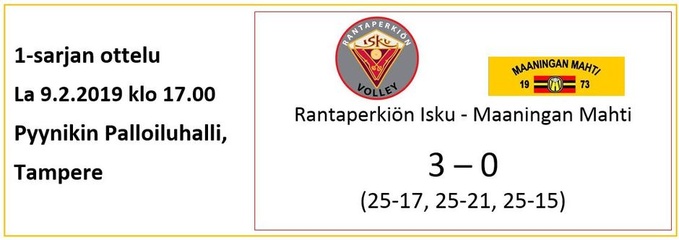 Sanonta kuuluu, pelipäivä on juhlapäivä ja näin totta totisesti tämä lauantai tulee olemaan, kun Mahti kohtaa kärkikamppailussa Rantaperkiön Iskun. Molemmat joukkueet ovat pelanneet hyvän alkukauden ja pelaajistoissa kokemusta riittää. Mahti hoiteli suhteellisen helposti viime viikolla Riennon ja viikko on taas saatu harjoitella pelaajien pysyessä terveenä. Vastus tulevaan peliin on todellakin eri luokkaa, eikä ilmaisia pisteitä ole tarjolla, joten Mahtimiesten on pidettävä oma vastaanotto-hyökkäys tehokkaana ja annettava syötöllä painetta Iskulle hajottaakseen sen vahvaa hyökkäyspelaamista.