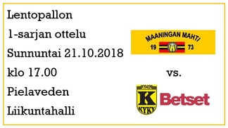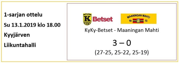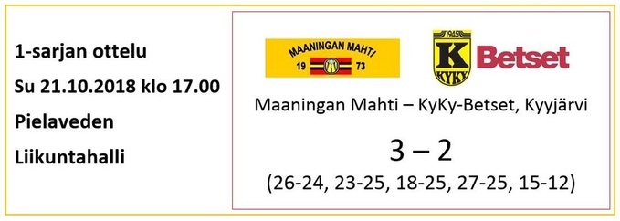 Nii vaan se sunnuntai lähestyy ja vastaan asettuu Pielavedellä kotikentällä sarjan kärkikahinoissa vuosia viihtynyt Kyyjärven KyKy-Betset. Mahdilla on vuosien varrella ollut hyviä vääntöjä tätä betonijoukkuetta vastaan ja tälläkin kertaa on odotettavissa tasainen ja viihdyttävä ottelu. Viime viikonloppuna Mahti kävi nappaamassa kuusi arvokasta pistettä vierasreissulta ja ympärillä miehet käyvät tutummiksi. Tervonen on palannut reissultaan takaisin ja viime viikolla kiusannut flunssa-aalto on mennyt ohi. Joukkue odottaa innolla kentälle pääsyä, vastus edellisviikonlopusta selvästikin kovenee, joten oma peli pitää pysyä kassassa ja syöttöpelin on oltava tehokasta. Viime kaudella KyKyllä oli vaikeuksia selviytyä pudotuspeleihin, mutta tänä vuonna se on taas panostanut laadukkaaseen joukkueeseen. KyKyllä on kasassa kuudesta ottelusta 13 pistettä. Se on voittanut ilman pistemenetyksiä TUTO:n, NaPan, Riennon ja KaVen. LeKille KyKy hävisi suoraan 3-0 ja Isku väänsi siitä tiukan 3-2 voiton. KyKy-Betset on siis saanut alkukaudesta runsaasti pelikokemusta. Sen selkeä ykköstykki peleissä on ollut viime kaudella Hurmoksessa vaikuttanut laituri Aivars Petrusevics. Joukkueessa on myös muita ulkomaalaisia, kuten latvialainen passari Jansons sekä viime kaudelta jatkanut ukrainalainen yleispelaaja Liunenko. Myös liigakokemusta omaava Mikko Väliaho on kova pelote verkolla ja hyvinkin tuttu kaveri pielavetisille.