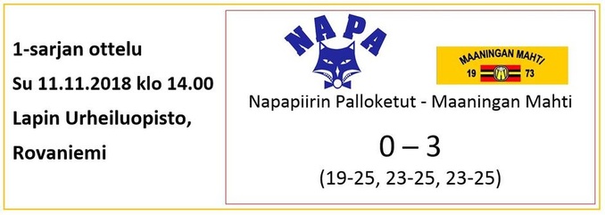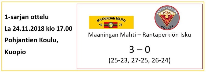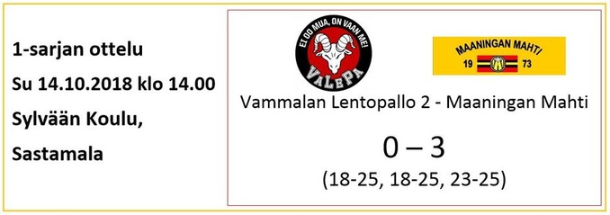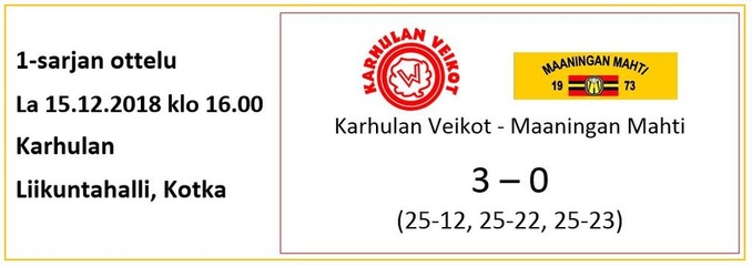 Lieneekö pitkähkö bussimatka vienyt Mahtimiesten viimeisetkin "mehut", sillä peli lähti tosi huonosti liikkeelle eikä se oikein missään vaiheessa palannut normaalille tasolle. Tulos oli sitten sen mukainen ja Karhulan Veikot otti ansaitun kotivoiton, kun Mahtimiehillä oli vaikeuksia erityisesti vastaanotossa ja syötössä läpi koko ottelun. Surkean avauserän jälkeen toiseen ja kolmanteen erään Mahtimiesten otteet jo paranivat hieman, mutta ei vaan riittäneet loppuun asti. KaVe parempi tällä kertaa suoraan 3-0.